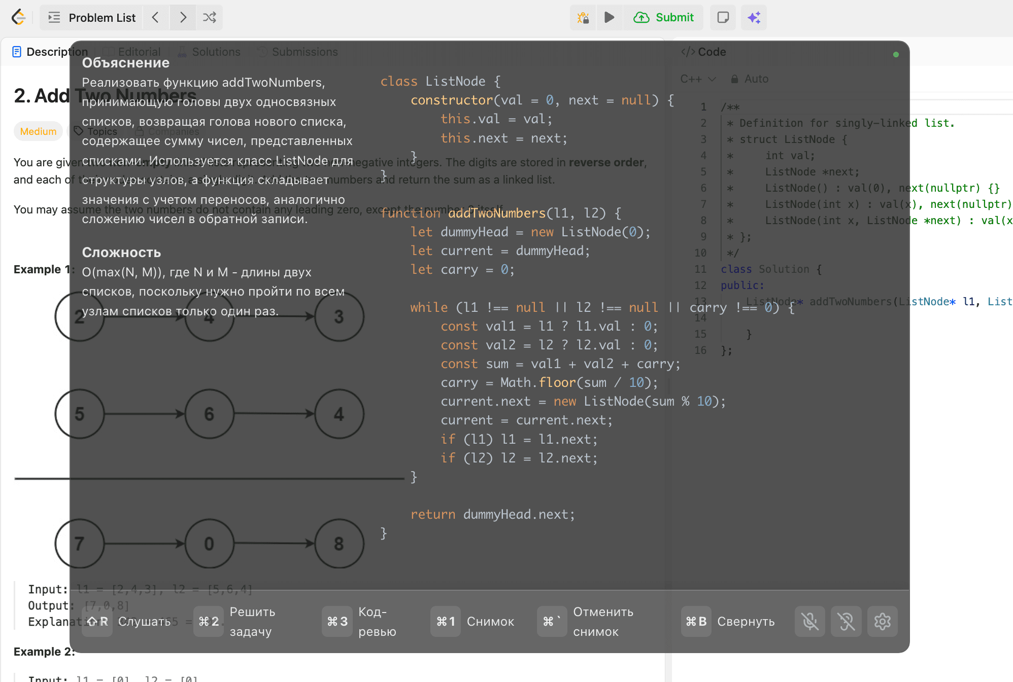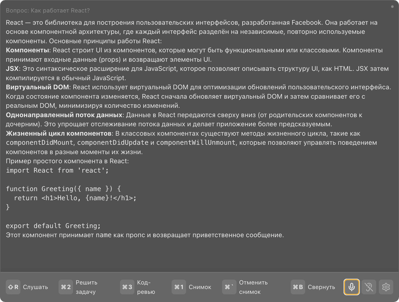 Зажав клавиши ⌘R — программа будет слушать собеседника или тебя и мгновенно подскажет ответ на устный вопрос