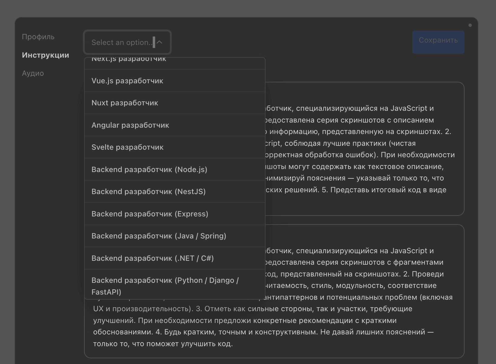 Выбери Backend, Frontend, DevOps и многое другое из пресетов. Или задай свои кастомные промпты, чтобы добавить уникальность и контекст ответам